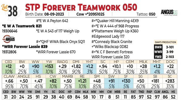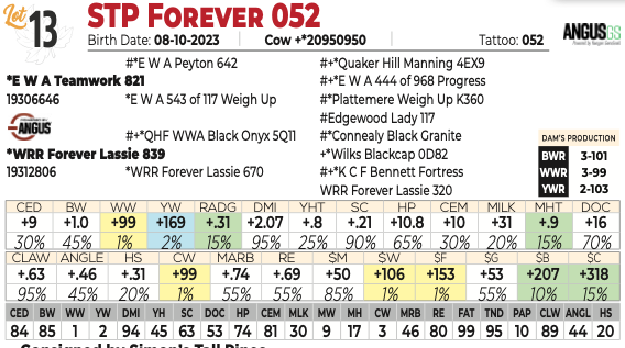 Sells with a 8/10/25 bull calf sired by Peak Draft Pick. AAA# 21333766. 68 lbs. STP Forever 052 is a must see on sale day. This female boasts growth numbers that are out of this world. She is a big spread female from birth to weaning and on to yearling. This young cow has all the makings of one that could go out and do big things for any herd. Ranks in the top 1% for $F, $W, CW and WW; top 2% for YW; top 10% for $B; top 15% for $C; top 20% for MILK.